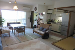 伊東市宇佐美・フジタ第三宇佐美マンション3階部分、定期的に別荘としてご利用中のお部屋です。斜になりますがリビングやバルコニーから海を眺望!海の碧さと山の緑と空の青さのコントラストは気持ちが落ち着く心地よい眺めです。室内は丁寧にご利用されていることが伺え、コンディションは悪くないと見受けます。間取も2LDKですので、使い勝手は宜しいと思います。LDKも広めで、キッチンにはカウンターが設けられていました。リビングと和室は続き間で、襖で仕切ることができます。洋室には腰高窓がありす。浴室には広い窓があり、山の自然風景が眺められました。バルコニーは北東向きのため陽当りは期待できません。