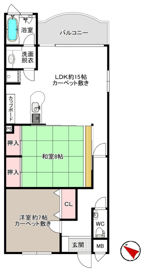 約15帖LDK角部屋・掃き出し窓と腰高窓 |