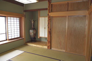 1階8帖和室・床の間、床柱、鴨居、木襖 |