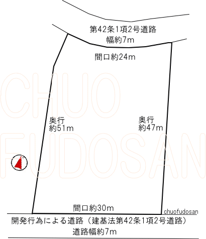南側幅約7m、北側幅約7mの建基法第42条1項2号道路(開発行為に基づく道路)に接道 |